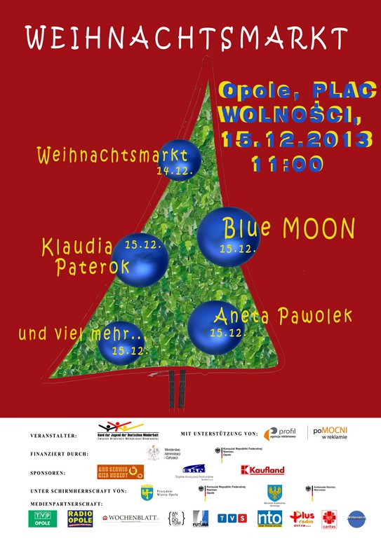 Zum elften Mal lädt der Bund der Jugend der Deutschen Minderheit zum Weihnachtsmarkt ein, der am Sonntag den 15. Dezember 2013 von 11.00 bis 19.00 Uhr am Freiheitsplatz in Oppeln stattfinden wird.